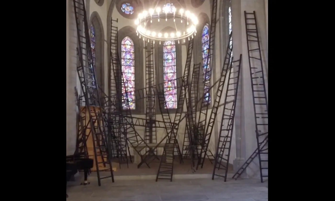 Les échelles noires, dont les plus hautes atteignent seize mètres, s’entremêlent dans l’église pour souligner des points particuliers et choisis du lieu, à l’image de celles qui sont placées dans le chœur, avec un effet graphique et esthétique voulu par l’artiste. «Ces échelles ne sont plus praticables. C’est à la fois la fragilité et la prise de risque qui sont ici représentées», explique Sandrine Pelletier qui a eu carte blanche pour ce projet. L’artiste y voit le miroir de notre actualité: un monde dans lequel la décrépitude des choses et les accidents sont très présents.